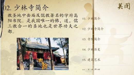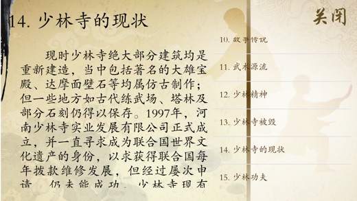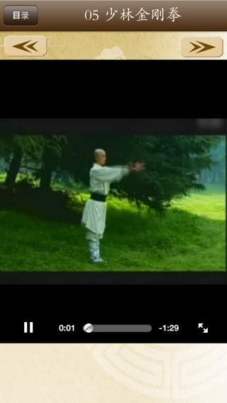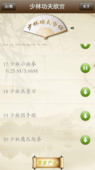 少林功夫术的要旨是禅武合一。少林寺是佛教禅宗的祖庭,禅宗以明心见性、顿悟成佛为要旨。在佛门眼中,参禅是正道,拳勇一类乃是末技,僧众们不过是借练功习武达到收心敛性、屏虑入定的目的。同时也可收到健身自卫、护寺护法的效果。少林功夫具有完整的技术和理论体系,它以武术技艺和套路为表现形式,而以佛教信仰和禅宗智慧为文化内涵。 《少林功夫欣赏》精选了53篇原汁原味的少林功夫演练视频。并配有少林功夫相关文化介绍(少林寺简介、少林历史、禅法传说、武术源流、少林功夫分类、佛教传入中国的诸传说、中国佛教、少林禅乐等),便于读者更好的了解少林功夫。产品还增加了按需下载功能,方便用户选择所需视频。 《少林功夫欣赏》示范视频具体包含以下内容。 01少林八步连环拳 02少林达摩易筋经 03少林大洪拳 04少林单匕首一路 05少林金刚拳 06少林看家拳 07少林连手短打 08少林罗汉拳第一路 09少林炮拳 10少林披身刀 11少林三十六棍 12少林十路谭腿 13少林四门派双节棍 14少林通背拳 15少林卧龙刀 16少林五虎群羊棍 17少林小洪拳 18少林燕青刀 19少林阴手棍 20少林鹰爪炮拳 21少林基本功 22少林功夫拳 23少林单刀 24少林朴刀 25少林醉剑 26少林双刀 27铁布衫 28齐眉棍 29少林规定剑 30铁沙掌 31少林集体刀 32少林春秋大刀 33双鞭 34少林牧羊鞭 35少林螳螂拳 36少林铁头功 37少林规定拳 38南拳 39少林规定枪 40双刀破棍 41三人对棍 42少林三节棍 43少林月牙铲 44银枪刺喉 45腹卧钢叉 46卧刀破石 47太祖长拳 48打不出山门 49梢子棍进棍 50朴刀进枪 51追风赶月刀 52双风贯耳 53罗汉撞钟 技术支持: 如在使用中有任何问题和建议可联系我们: 纳达书院QQ: QQ1:568791426 QQ2:2475369261 纳达书院微博: http://weibo.com/ndapk 开发者信息 上海华烽电子商务有限公司是一家专注于移动应用开发的现代化高科技企业。旗下纳达书院(www.ndapk.com),面向智能手机用户和平板电脑用户,开发了音乐、诗词文、外语、早幼教、中小学、百科知识等系列移动应用。