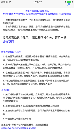 您有没有偶然得到有了一个地点的经纬度的坐标,却不知道这个地点在哪的时候? 本软件就是为了解决这个问题,您可以方便的把经纬度转换成地图上的具体的地点,也可以把地图上的某一点转换成经纬度坐标。 转换方式有以下几种 1. 在地图下方的经度、纬度输入框中分别输入经度和纬度,点击转换按钮,地图上会以红指针标出该地点所在 2. 用一根手指头长按地图上某一点超过0.5秒,松开手指,该点的坐标会显示在在经度、纬度输入框中,并在地图上以红指针标出该地点 3. 在地图上方的搜索框中输入地点的名称,软件会搜索服务器,将得到的坐标显示在在经度、纬度输入框中,并在地图上以红指针标出该地点 4. (该功能需要在系统设置…