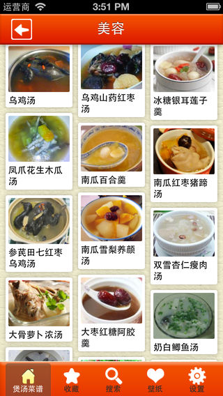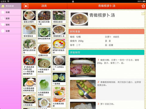 ♡♡苹果商店最全面最美味最良心的专业煲汤菜谱大全♡♡ ☆忙人、懒人、达人的健康靓汤大全。 ☆本APP提供最新最全的健康煲汤食谱,精选1600例营养好喝的超级靓汤, 四季经典靓汤, 养生滋补靓汤, 美容养颜靓汤等等。 ☆分类包括夏日甜汤、婴儿煲汤、儿童煲汤、孕妇煲汤、产妇煲汤、老人煲汤、强身润肺煲汤、美容养颜煲汤、减肥瘦身煲汤、益气理血煲汤、滋阴润燥煲汤、清热祛火煲汤... ☆取材容易,制作简单,视觉与味觉并重,所选汤菜佳肴,精美的图片加简明的文字,让你快速成为厨房高手,试试我们介绍的一些小窍门,您肯定会煲出鲜美的汤以飨家人,养好家人的胃,全家都幸福安康。 煲汤小技巧: ☆选料得当是制好鲜汤的关键 - 用于制汤的原料,一般为动物性原料,如鸡、鸭、猪瘦肉、猪肘子、猪骨、火腿、板鸭、鱼类等,但必须鲜味足、异味小、血污少。 ☆食品要新鲜 - 新鲜并不是历来所讲究的“肉吃鲜杀鱼吃跳”的“时鲜”。现代所讲的鲜,是指鱼、畜禽杀死后3~5小时,此时鱼或禽肉的各种酶使蛋白质、 脂肪等分解为氨基酸、脂肪酸等人体易于吸收的物质,此时不但营养最丰富,味道也最好。 ☆炊具要选择 - 制鲜汤以陈年瓦罐煨的效果最佳。瓦罐是由不易传热的石英、长石、黏土等原料配合成的陶土,经过高温烧制而成,其通气性、吸附性好,还具有传热均匀、散热缓慢等特点。 ☆火候要适当 - 煨汤的要诀是:旺火烧沸,小火慢煨,这样才能使食品内的蛋白质浸出物等鲜香物质尽可能地溶解出来,以便达到鲜醇味美的目的,只有文火才能使浸出物溶解得更多,既清澈,又浓醇。 ☆配水要合理 - 水既是鲜香食品的溶剂,又是食品传热的介质,水温的变化、用量的多少,对汤的风味有着直接的影响,用水量一般是煨汤的主要食品重量的3倍,同时应使食品与冷水共同受,,既不直接用沸水煨汤,也不中途加冷水,以使食品中的营养物质缓慢地溢出,最终达到汤色清澈的效果。 ☆搭配要适宜 - 许多食物之间已有固定的搭配模式,使营养素起到互补作用,即餐桌上的“黄金搭配”。 例如:海带炖肉汤,酸性食品肉与碱性食品海带起“组合效应”,为了使汤的口味比较纯正,一般不用很多品种的动物食品同煨。 ☆操作要精细 - 注意调味用料的投放顺序。特别注意熬汤时不宜先放盐,因盐具有渗透作用,会使原料中水分排出,蛋白质凝固,鲜味不足。一般地说,60℃~80℃的温度易引起部分维生素破坏,而煲汤使食物温度长时间维持在85℃~100℃。 ☆喝汤时间要讲究 - 常言道:“饭前喝汤,苗条健康”、“饭后喝汤,越喝越胖”。 ★ 上千食谱, 让你轻松成为煲汤大厨 ★ 人性化的分类, 方便选择适合你的汤煲 ★ 阅读简单, 操作方便, 简单易学 ★ 原材料详细列出, 图文分步骤详细教你如何做出美味 ★ 完美的收藏功能, 让你更方便的使用 ★ 完美的分享功能, 让你分享健康和美丽给你的亲朋好友 ★ 完美的离线功能, 不使用手机流量, 没有wifi, 也可以随时随地查看