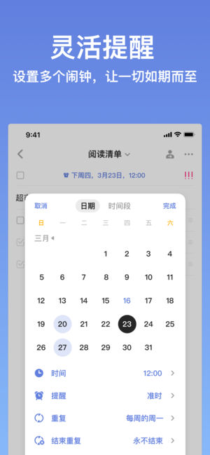 滴答清单,一款轻便的待办事项(Todo)、日程管理(GTD)应用,全球逾千万用户的共同选择。它可以帮你制定项目计划、设置会议提醒、 安排行程规划、保持工作专注,还能用于记录备忘、整理购物清单。滴答清单集计划表、备忘录、日程清单、笔记、便签、闹钟、日历、番茄钟、在线协作多种实用功能于一体,是你高效办公、目标管理、习惯养成及便捷生活的得力助手。 滴答清单多次得到 App Store 首页及专题推荐,还获得过豌豆荚「设计奖」,入围最美应用「2015年度精选应用」,被 CSDN 、好奇心日报、少数派等多家媒体推荐报道。 【高效规划】 - 多平台同步:云端同步。可从手机、平板、网页等设备随时随地查看…