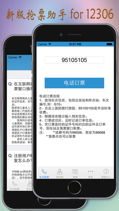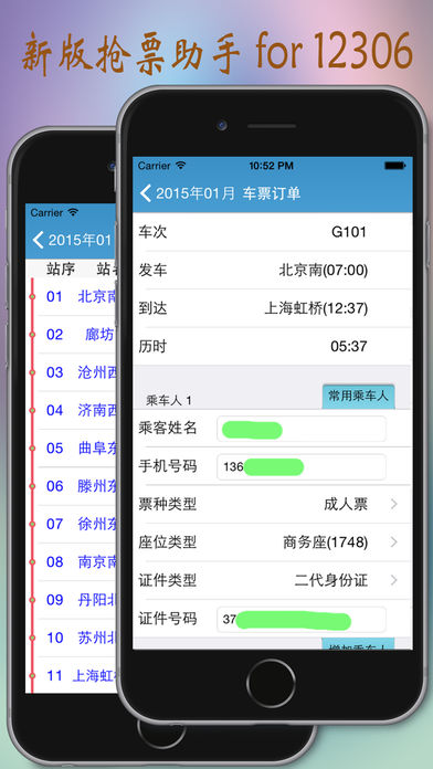 抢票助手 for 12306是一款基于中国铁路客户服务中心网(12306.cn)开发的移动设备客户端工具软件。 为您提供更方便,更快捷,更安全的火车票购买方式,也是您居家生活、驴友旅行、出门探亲、节日回家、欢度蜜月的必备的工具管家。 让您随时随地锁定列车座位号,不用再到火车站售票厅及火车票代售点排长长的购票队伍。 与12306在线购票同步,支持成人票、儿童票、学生票、残军票; 功能描述 ∆∆ 登陆,出于安全考虑,登陆需要输入验证码。 ∆∆ 查询余票,不登陆也可以查询当前余票。 ∆∆ 订票查询余票,登陆后的余票查询。 ∆∆ 订票,支持多人同时订票,在订票页面可以直接从常用联系人中选取订票人,方便、快捷。 ∆∆ 支付,可以通过本软件直接支付。 ∆∆ 订单管理 未完成订单查询、支付、取消,已完成订单查询. ∆∆ 常用联系人管理,添加新联系人。 ∆∆ 电话订票【iPad不支持】。 ∆∆ 常见问题解答。 ∆∆ https验证,整个订票流程无任何第三方平台交互, 直接与12306官网对接全方位保证订票安全。 支付方式: 部分银行手机支付有无法安装控件的问题,经过测试列银行可手机支付:招商银行(手机支付)、建设银行(帐号支付)、支付宝等。 注:工商银行、农业银行、中国银行、中国邮政都无法手机支付,如果本人没有上述可支付银行账号,你同样有45分钟的时间,来通过电脑支付。 抢票技巧 ∆∆ 提前添加常用联系人,购票时无需手动填写,购票快人一步; ∆∆ 随时查询,不时会有新票放出,或乘客退票,即时捡漏。
