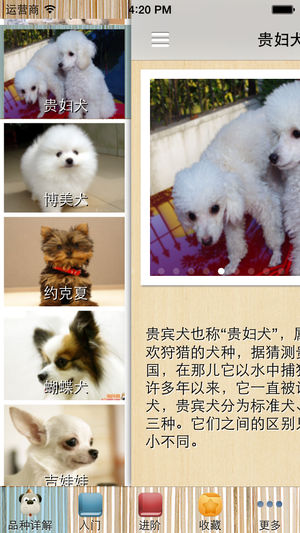 同时支持IPAD、IPHONE ,不耗流量,不用联网一样可以使用,无广告,无插件。 养狗大全分为养狗入门知识篇、进阶知识篇、名犬详解篇3大部分。全面系统地介绍了犬的各种生理特征、生活习性、毛色种类、名犬品种、饲养管理、调教与训练、育种与繁殖,以及常见疾病的防治等内容。以及养狗知识大全的汇总.其中名犬详解篇对世界公认的30余种名犬的品种、起源、发展史、外貌特征、鉴赏评判标准、用途、选购选育要领、饲养管理要点等均作了详尽的论述,并有各类高清名犬图片500多张。 目录 第一篇 入门知识篇 1、狗的起源与发展 一、狗的祖先是谁 二、狗是人类最早驯化的家畜 三、狗与人类文化 四、中国养犬现状…