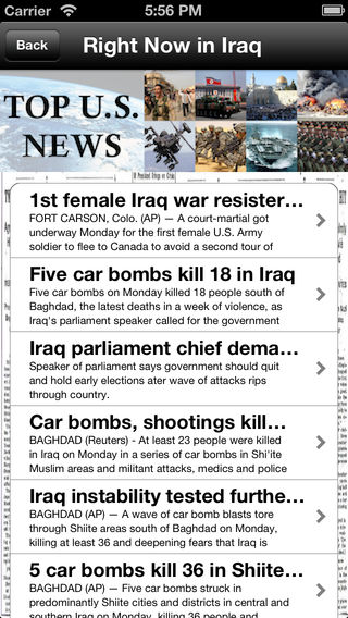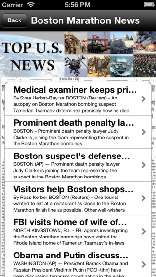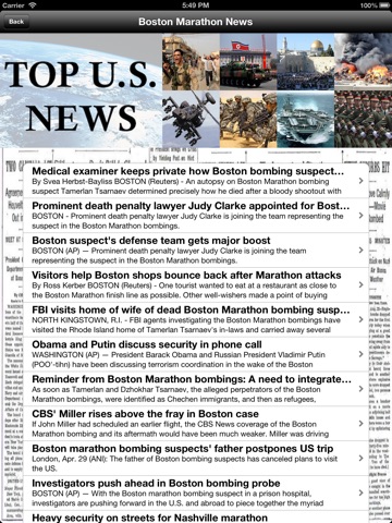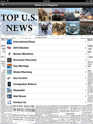 Tired of news apps and websites that inundate you with stories you have no interest in? Then you need the Top U.S. News app! This app brings you ONLY the stories you want, about the top events trending across the United States. When you click one of the topics listed in the app you will get 30 stories about that topic and that topic only - updated to the minute. There is no better way to stay informed. Topics are updated to include new stories as they break. Current topics include: News about the 2016 Election; News about the Boston Marathon Bombing; News about the Economic Recovery; News about Gay Marriage; News about Global Warming; News about Gun Control; News about Immigration Reform; News about the Sequester; and News about Wall Street.