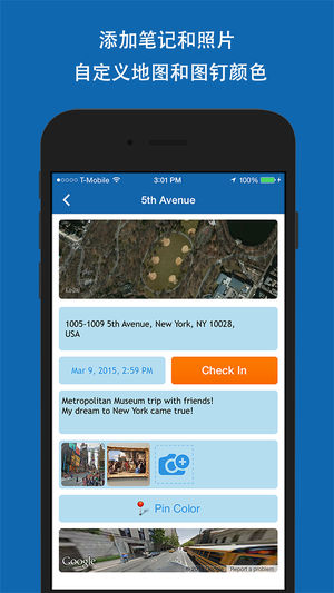 足迹是一款在地图上记录您去过地方的应用。无论您在这个世界的哪一个角落,您都可以轻松的进行记录。记录您的心路,添加照片,从街景里找到美好的回忆。离线更新技术让您在没有网络,没有信号的情况下,使用iPhone和iPad内置的gps进行定位,然后在有网络的情况下更新您离线标记的地址。热度地图统计您去过地方的次数,然后在地图上面一目了然地显示您访问的频率。您可以按照自己喜欢的颜色自定义热度地图和标记图钉的颜色。足迹提供多种地图样式,地形,卫星和混合模式。可以选择多种地图源,包括苹果地图,Google地图,Bing地图和Mapquest。最新版还加入了iCloud云同步。我这一生去过哪里?赶快下载来标记…