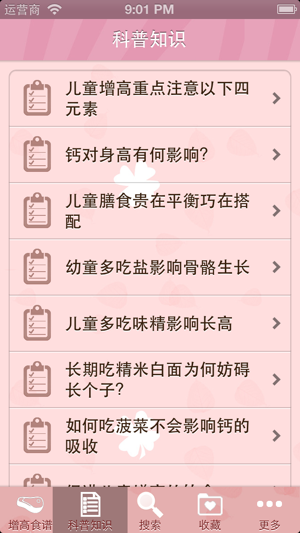 无广告,浏览速度快,不耗流量,本地浏览,不用上网也可以使用。 触摸图片就可已经进入具体食谱的做法,包括材料、做法和小贴士,并可以加入收藏。 特别精选150多道食谱及发育增高的科普知识,通俗易懂,实用易做,让你巧搭膳食,有针对性地补充孩子身体所需钙、蛋白质、维生素、矿物质。让你的孩子“骨气”十足,告别矮个头,拥有强健体格。孩子补钙,刻不容缓。