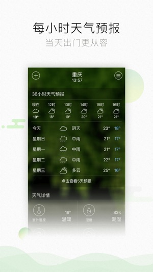天气应用免费榜第一名!独家提供:未来10天天气预报,覆盖全国所有市县的PM2.5空气污染指数,36小时预报,室外温度、湿度、能见度、紫外线、日出日落时间预报。外出旅行、上班出门前必看APP。 支持国内外4600多个城市,支持手机定位获取天气,支持早晚天气推送和恶劣天气预警推送。界面细腻简洁小清新。 主要特点: 1.界面细腻简洁小清新,高端大气上档次; 2.独家未来10天天气预报,旅行计划有保障; 3.独家未来36小时天气详情,上班外出无忧愁; 4.覆盖全国所有市县的PM2.5空气污染指数播报; 5.独家室外温度、湿度、能见度、紫外线预报; 6.当前风力风向播报,生活出行更便利; 7.多个城…