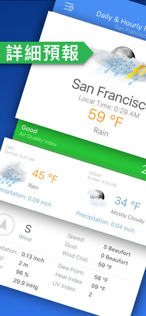 追踪未来最多10天内的暴风雨,飓风或其他天气现象。 查看极其详细而准确的天气状况并跟进天气动态。 这款应用让您避免在暴风雨中野餐,或者帮助您在进行常规户外锻炼时避开大雨,以免淋湿着凉。 有了天气雷达,您可以时刻关注每分钟的天气变化,避免措手不及的尴尬情形。 现在,您可以参考空气质量指数,在空气污染水平最低的时段安排户外活动。 您爱用 天气雷达 的原因 • 实时降雨和降雪雷达 • 追踪飓风 • 极端天气预警 • 空气质量指数 • 地图警告(洪水和飓风) • 分日与分时天气预报 • 图表:温度、降水、风、气压和紫外线指数 • 视觉效果精美直观 天气预警* 及时了解极端天气状况! 若您当前所在…