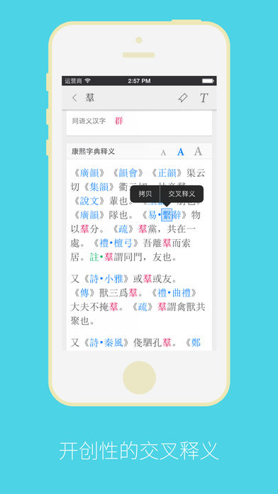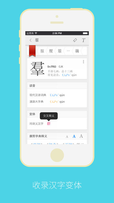 --- 康熙字典—汉字大成 2.0.3 将是能够运行在 iOS 6 中的最后一个版本,我们正在全力以赴制作支持新发布的 iPhone 6 和 iPhone 6 Plus 的新版本。届时,版本号将升级为 3.0,运行在 iOS 7 和 iOS 8 系统中,并将符合最新公布的 Unicode 7.x 标准。 您将可以免费升级到 3.0 版本。 --- 全新打造,倾情奉献。但我们依然是那个收录了超过 75,000 汉字的康熙字典—汉字大成! 康熙字典—汉字大成 2 载着满满的诚意全面上线。重新设计的架构,完全重新编写,使整体性能得到大幅提升,即使在您的 iPhone 4 中使用也是如此。 康熙字典—汉字大成 2 现已支持繁体中文! 【美国和中国大陆两组独立的服务器】 为了提高在线服务质量,当您浏览康熙字典影印版和浏览多达 10 种汉字字型时,可以选择不同地域的服务器为您提供服务。我们在美国和中国大陆分别设置了两组独立的服务器组,完全避免了由于某些非技术原因而导致的在某些位置无法得到上述服务的可能性。 【特色功能】 - 内置的数据:应用程序整体尺寸得到充分优化,不再需要另外下载数据包; - 更自然的手势操作:康熙字典—汉字大成 2 的手势操作更加自然敏捷,从此手势不再难以掌握; - 拆字查询:康熙字典—汉字大成独树一帜的功能,在这个版本中也得到了大幅优化和提升; - 四角号码检字法:新加入了四角号码检字法,让专业汉字研究变得更轻松; - 《康熙字典》原版影印版浏览:已将图像数据部署在美国和中国大陆两组独立的服务器中,从此服务不再断线; - 多达 10 种汉字字型:应用程序提供包括《康熙字典》原版复刻字型在内的 10 余种字型的浏览功能; - 康熙字典总目:按照《康熙字典》古体编排,按地支分为十二集,每集又分上中下三子集,康熙字典从此更有康熙字典味; - 其他 200+ 功能:完全继承和延续了康熙字典—汉字大成的优势,提升和优化了所有功能,请在使用中慢慢体会。 【感谢】 感谢您多年的支持与鼓励,您是我们前进的唯一动力。 【美国和中国大陆两组独立的服务器】 为了提高在线服务质量,当您浏览康熙字典影印版和浏览多达 10 种汉字字型时,可以选择不同地域的服务器为您提供服务。我们在美国和中国大陆分别设置了两组独立的服务器组,完全避免了由于某些非技术原因而导致的在某些位置无法得到上述服务的可能。 【特色功能】 - 内置的数据:应用程式整体尺寸得到充分优化,不再需要另外下载数据包; - 更自然的手势操作:康熙字典—汉字大成 2 的手势操作更加自然敏捷,从此手势不再难以掌握; - 拆字查询:康熙字典—汉字大成独树一帜的功能,在这个版本中也得到了大幅优化和提升; - 四角号码检字法:新加入了四角号码检字法,让专业汉字研究变得更轻松; - 《康熙字典》原版影印版浏览:已将图像数据部署在美国和中国大陆两组独立的服务器中,从此服务不再断线; - 多达 10 种汉字字型:应用程序提供包括《康熙字典》原版复刻字型在内的 10 余种字型的浏览功能; - 康熙字典总目:按照《康熙字典》古体编排,按地支分为十二集,每集又分上中下三子集,康熙字典从此更有康熙字典味; - 其他 200+ 功能:完全继承和延续了康熙字典—汉字大成的优势,提升和优化了所有功能,请在使用中慢慢体会。 【感谢】 感谢您多年的支持与鼓励,您是我们前进的唯一动力。