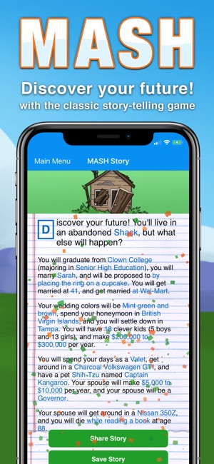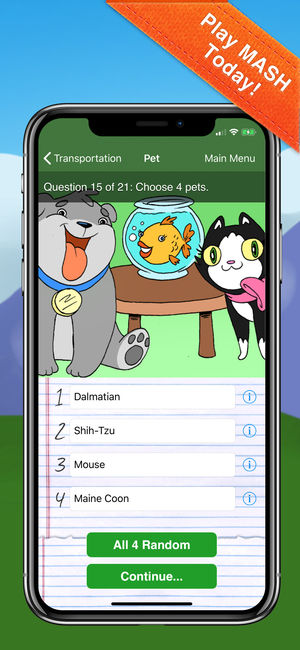 The Classic MASH: Mansion Apartment Shack House game for iPhone and iPad! An App Store Essential! Now with Stickers for iMessage. OVER 14 MILLION DOWNLOADS OF MASH & MASH LITE! More than 20 questions to answer! Choose which to ask! Want to find out who you or your friends will marry? Are you goin…