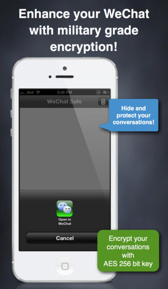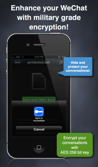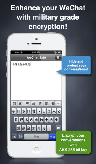使用軍用式加密來保護您微信的訊息,避免給第三者閱讀。 請先安裝微信,才能使用微信加密 功能: 1) 當您跟對方同時安裝了微信加密,您們便可以使用軍用式的加密方法來傳送訊息。如沒有密碼,第三方是不能偷閱或截聽您們的對話。 2) 所有對話會被隱藏,就算電話遺失了,沒有密碼也是不能閱讀訊息的。 3) 軍用級 AES-256 bit 加密。 用法: 1) 先在微信加密輸入您的訊息,然後按“傳送” 2) 輸入一個只有您和收件人知道的密碼,然後按 OK 3) 微信會啟動,選擇您的收件人,加密了的訊息便會送出。 解密: 1)在微信按一下加密了的檔案,選擇 “Open with Other Apps, 然後選取 ” 在微信加密裡打開 “ 2)輸入密碼,訊息會被解密。 Enhance Your WeChat with military grade security! When both parties have installed WeChat Safe, you can send message to each other with military grade encryption! Usage: 1) Simply enter your message in WeChat Safe 2) press Send and enter a password where only both of you will know 3) Press OK, WeChat will launch and simply select the person you want to send to 4) The other party will receive the encrypted file, he can simply press on it, use Open With... WeChat Safe, enter the password, and message will be decrypted! All messages are hidden, so even if you lose your phone, without the password, no one can view your dialogues! Disclaimer: This App requires data. By downloading and continue to use this application, the user therefore agrees that the author of this application is not responsible for any liability whatsoever arising by using this app, or from any inaccurate or incomplete information, or for any information offered and any consequences caused by the informations that was transferred by WeChat Safe.