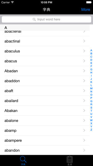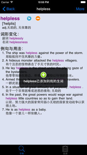 《英汉大字典》当前共收录了超过18万个英文单词,并提供快速检索功能,轻松查词。 《英汉大字典》的每个单词都有标准的真人发音、音标、详细注解、词形变化以及例句用法等。 《英汉大字典》提供了生词本的功能,可以将任意单词加入生词本,方便您学习。 《英汉大字典》完全离线运行,无需联网。由于内置了真人语音库,因此软件的体积较大,请在WIFI环境下下载。 《英汉大字典》是您出国旅行,学习英语必备的工具。