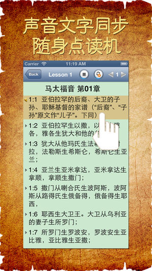 注意:该版本为中文朗读版,默认不显示英汉对照,您可以在设置里面选择打开英汉对照。 圣经新约全书(New Testament),由福音书(马太福音、马可福音、路加福音、约翰福音)、使徒行传、使徒书信和启示录组成。使徒书信分保罗书信和一般书信;保罗书信又分教会书信、个人书信、监狱书信和希伯来书。 追随上帝耶稣的踪迹,现在开启你的圣经新约之旅吧。 本应用具有进度管理功能,记录您阅读圣经的每一个足迹。 本应用具有经文测试功能,测试每一句经文。此功能Appstore仅此一家,不可错过。 本应用将帮助您有效的阅读圣经新约,其他特色: 1. 声音字幕同步,边听边读。 2. 点读功能,全文定位点读,点…
