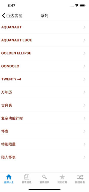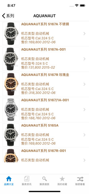 目录及报价更新到2015年最新版本。 世界手表大全为广大手表爱好者、消费者提供最大最最全面的腕表信息。 软件目前共收录70个品牌,3万5千多款手表, 从顶级奢华到时尚亲民等应有尽有, 是不可多得的随身手表参考应用! 每个品牌均可按系列、价格、机芯类型、男表、女表、中性表、表壳材质、表盘颜色、表盘开状进行筛选查看。 提供品牌简介,手表专卖店地址供查询。 可以将喜欢的手表加入收藏夹方便随时查看。