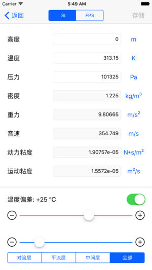 本应用可快速计算出不同海拔高度下的标准大气参数。数据参考《US Standard Atmosphere 1976》。 可在高度-压力-密度之间互查。 可提供的参数有:高度、压力、密度、温度、重力加速度、音速、动力粘度、运动粘度。 可设置海平面温度偏差。 可保存常用的高度剖面,便于快速参考。 支持公制单位系、英制单位系以及自定义单位系。 可提供的高度范围从-5000米至86000米。