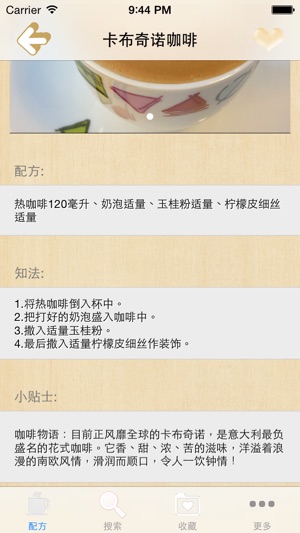 精选了200道经典的冰热咖啡详细配方,将冰热咖啡华美魔幻的视觉效果和丰富的口感呈现在您面前,方便您在家中阅读制作和咖啡师参考借鉴。 为自己,为家人亲手煮上一杯浓情蜜意的咖啡吧,美味自不用说,单单那份做咖啡的心情就足以让人完全陶醉其中。口中品尝的是咖啡,而在心中品味的确是生活。入口苦涩,入喉甘甜,入心舒,生活之意尽显其中。如果你是一位热爱生活的人,那么你就很可能是一位喜欢咖啡的人。如果你心动了,那么就请你随我们一起来品味优质的的咖啡、品味雅致的生活吧。 离线浏览,不用联网也可以浏览,速度快,无广告。