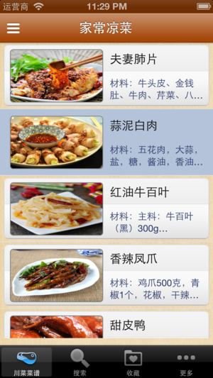 精心挑选川味家常菜及火爆流行菜式,按原料细分家常凉菜、经典小炒、猪肉类、牛肉类、水产类、素菜类、小吃类等七大类,每道菜式均配精美图片,按步骤详细讲解,每步并配有相应图片,保证可以成功操作100%,有图有真相,以及所用的食材的营养分析,是您的川菜烹饪宝典。 无广告,浏览速度快,不耗流量,离线本地浏览,不用上网也可以使用。