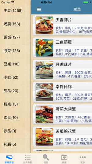 精选大众最爱吃的经典家常菜,将菜细分为家常凉菜、家常炖补、养生汤、家常小炒、猪肉类、羊肉类、蔬菜类等。更为喜爱饮品、甜点的时尚人群和重视四季养生的人群编写了专门的食谱。每个菜品均详细介绍了原料、做法和特点。,详尽介绍了原料、制作方法、特点。教您做出地道美味。 无广告,浏览速度快,不耗流量,离线本地浏览,不用上网也可以使用。
