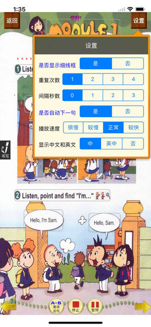 小虫子点读机,点哪里读哪里。兼容iPad和iPhone。 本程序供学习外研社三年级起点小学英语教材的学生使用。 需要旧教材的用户请下载新上线的“旧版”程序。 本程序除了像普通点读机一样能点读课本外,还能设置【是否自动下一句】、【朗读重复次数】、【朗读延时间隔】、【显示中文和英文】功能。 具有复读功能。支持后台锁屏播放;同时支持划屏翻页操作,也能做课本的电子书使用。 具有书写功能,可以边听边写。 单词学习模式包括单词浏览、英文点读中文、中文点读英文、单词默写功能。 注意:本程序可点读内容仅包括官方磁带内容,并不包含所有书本内容,但为保证阅读的完整性,则程序包含了除点读外的其他阅读内容。