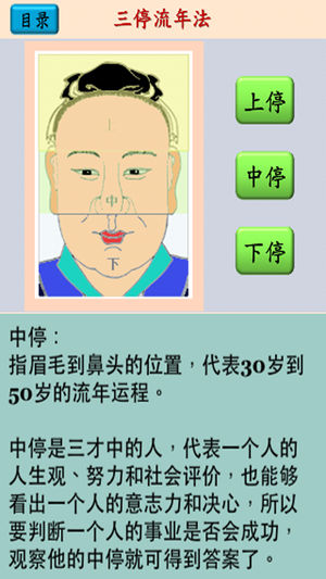 "面相图解" 收集了面相学的一些基本资料, 以图解的触控方式浏览, 很方便参考. 内容分为 4 个部分: 1. 面相六法 2. 十二宫相法 3. 三停流年法 4. 面相痣 再加上 "设定" 可以选择: 1. 中文简繁体 2. 页面字体大小 3. 页面背景及字体颜色