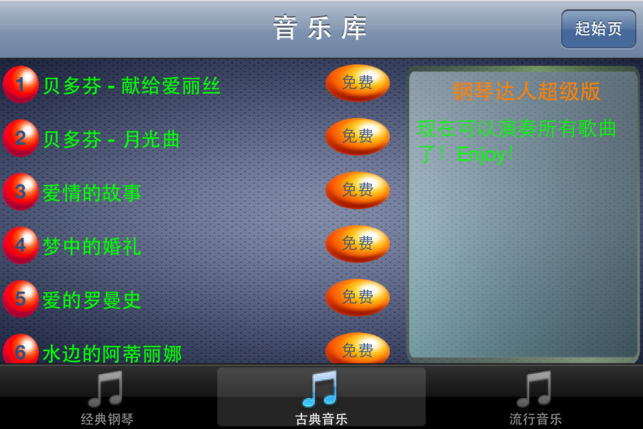 每个人都能为钢琴家,钢琴达人让你轻松弹奏世界钢琴名曲,献给爱丽丝,秋日私语,星空等100多首古典和现代钢琴曲。最真实的钢琴声音,学习功能,让你熟悉每一首钢琴曲再弹奏,还可以保存并且回放弹奏记录。