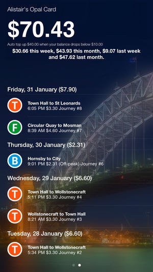 Use My Opal to track your balance across multiple Opal cards and see your recent journey history across Sydney trains, ferries, buses and light rail. Features include: · Journey history · See how much you paid for each leg of your journey · Display balances for multiple Opal cards registered un…