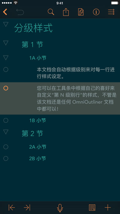 OmniOutliner 从空白页开始。但是随着收集、编写与重新整理文本,其超强的大纲功能便开始显露,可供您组织自己的想法。层次、栏、样式、备注 - 同时使用或使其保持简单,具体视手头的项目而定。从基本的列表和表格到正式的写入和数据移动,OmniOutliner 知道如何使您的工作井然有序。 为什么选择 OmniOutliner for iOS? 舒适:OmniOutliner 设计时将速度与简便铭记于心,特别针对数据输入。精心规划的键盘交互和无时不在的编辑栏,使其可供直接添加和重新安排项。每个想法皆很重要,OmniOutliner 只是帮您将其理顺。 结构:展开和收起组以集中精力解决眼下重要的事务。使用“添加行”按钮的弹出模式以在所需位置添加新项。当然,需要重新调整顺序时只需拖动项即可。如果需要作出较大的改动,可使用编辑模式立即移动或修改多行。 栏:复选框、格式化数字、弹出列表、数据… 记录各行中不同字段的所有数字。如果一次需要看太多行,可以隐藏部分行。或只是进行拖动,以到达您感兴趣的内容。还可通过任意栏对行进行排序,然后也可恢复其原始顺序。 样式:凭借含有的模板和样式,您无需自行做出任何调整。但是,如果您想要调整,可尝试我们自定义的多信息文本编辑器,其拥有的详细样式比您可以在 iOS 其他位置找到的都要多。将您喜欢的样式另存为已命名样式,以快速统一文稿中的样式。配置各行,使其根据层次结构进行样式化。您甚至可以将模板中的样式应用到您当前的文稿中。 备注:内联备注可让您轻松记录有关未来修订的想法、附属内容、评论家的评论、尚未考虑成熟的概念、笑话以及其他各种信息。您可以将备注附加至文稿中的任意一行,单独或一起显示或隐藏。当然,也可如主内容一样精确地设计备注的样式。 链接与附件:输入的 Web 地址将自动加上超链接。从小修饰到草图,从绘图应用程序到原尺寸照片,任何复制粘贴的图像都可以放在您的大纲中。 共享:OmniOutliner 不乏共享文稿的方式。通过我们的同步技术 OmniPresence 自动同步您的文稿,或以多种格式通过电子邮件发送文稿,比如:OmniOutliner、OPML、HTML、DOCX、CSV 或纯文本 OmniOutliner 2 的新功能包括: • 模板:当您创建新文稿时,将为您提供一个模板列表以供从中选择。可以轻松地将现有文稿转换成模板,或从头开始创建一个模板。 • 样式主题:是否想要让某个文稿的外观变得类似于另一个文稿?将目标文稿转换成模板,并将其应用到想要的任何文件。 • 外部键盘支持:更快地编写大纲!在您的文稿中导航、重新安排各行以及添加新内容,所有这些都不需要触摸屏幕。如果您使用 OmniOutliner for the Mac,您一定已经熟知所有这些快捷方式。 • 文件夹:您的 iOS 设备上有大量大纲?请使用文件夹来组织它们。对于使用 OmniPresence 进行同步的用户,则可以在 Mac 上看到同样的文件夹。 • 导出格式:是否已完成项目的大纲构建部分?使用 DOCX 格式将您的数据导出到文字处理应用程序进行下一阶段。需要切换到电子表格应用程序?请使用 CSV 格式发送您的数据。 支持:如果您有任何的反馈或问题,敬请告知!Omni Group 可为您提供免费的技术支持:您可通过电子邮件 (omnioutliner@omnigroup.com)、电话(1-800-315-6664 或 +1-206-523-4152)或 twitter (@omnioutliner) 与我们取得联系。 谢谢!