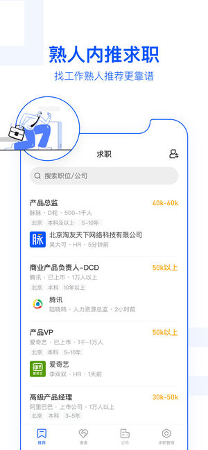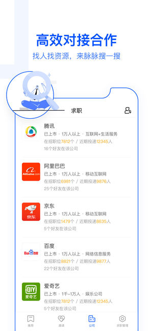 脉脉,职场人追捧的商务社交神器!相比于线下耗时耗力的商务社交,脉脉借助独有的“职业认证+实名社交”,帮助职场人更方便高效地在线上拓展人脉、交流合作、求职招聘,能极大地提升工作效率和增加职业机遇。职场人都在用脉脉,你还不来? 为什么要用脉脉? 【拓展人脉】智能“推荐+搜索”功能高效拓展人脉,比混群、跑会场更有用 【塑造形象】完善个人资料,有脉脉职业身份认证作背书,能获得更多机遇的垂青 【职场交流】关注职言板块,既能分享职场正能量,也能轻松问薪水聊面试 【工作内推】求职时搜索在意向公司的好友名单,简历让朋友内推更有效 【洽谈合作】在脉脉搜索关键词,能快速精准找到合作方的决策人 谁需要脉脉会员…