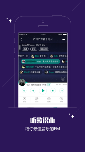【让FM变酷】 首款自动识别歌曲的FM电台产品。 酷狗核心音频技术打造,同类电台收音机中音质最好,播放最流畅。 马上下载体验吧!O(∩_∩)O~ 【主要功能】 - 电台直播:1200多个电台网络全天直播,无时无刻精彩不停。 - 回听下载:热门电台回听节目下载,随时随地,想听就听。 - 节目点播:海量热门电台节目每日更新、一点即播。 - 主播空间:热门主播强势入驻,互动零距离。 - 智能识曲:首创智能识别电台播放中的音乐,好歌不错过。 - 实时搜索:搜索电台、节目、主播,实时显示,简单便捷。 - 定时功能:定时关闭或播放你喜欢的内容,伴你入睡,唤你醒来。 - 打赏功能:给喜欢的主播或节目打赏,…