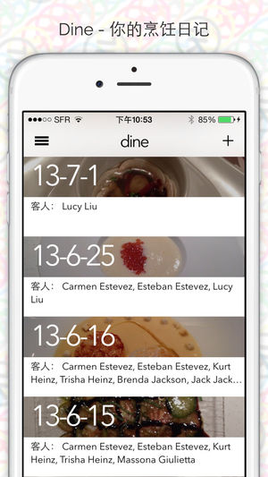 你的烹饪日记!记录你的晚餐派对。用靓丽的照片记录下你的菜单和菜品,按日期查找,不要两次做一样的菜。把你最好的菜单和最漂亮的菜做成一个相册,在Facebook上分享。