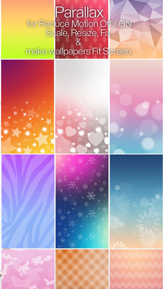 Optimized for iOS 8. Enjoy the new wallpaper. * * * Limited time SALE! 50% * * * Do you still use typical and dull backgrounds? NewWallpaper is the finest wallpaper app you have found yet. Enjoy your own fancy wallpapers by using New Wallpaper, which includes cool images of high quality created by a professional designer and more powerful editing functions. The moment you experience NewWallpaper, you’ll be able to see your newly born screen. Enjoy your imagination with NewWallpaper. Download NOW! ------------------------------------------------ - Introduction - * Chic and cool images (Retina) - is app that helps you customize the look of your device by giving you an exclusive selection of specially designed backgrounds. - We provide a variety of library images: Pattern, Color, Blur, Calendar, Backgrounds - Main theme (Reduce Motion > On (1:1Scale) ) : Lock screen, Home screen. - Bonus item : Parallax Scale Preview * Customize - We can create endless image combinations and depending on your diversified taste, you can also utilize your favorite photos to create special wallpaper backgrounds. - use your own photo. Customize font, color, frame shape and more. - adjust saturation, brightness and contrast of each image. * Preview & Resize 1:1Scale (Lock Screen, Homs Screen), Parallax Scale (Lock Screen, Homs Screen), Instagram, Messenger background instant preview feature that allows you to quickly preview your new background or app shelf. for Reduce Motion On (1:1Scale) / Off (Parallax Scale) Are you facing problems trying to resize wallpapers in iOS 7? Resize, scale & make your wallpapers to fit screen. It also allows to design your own wallpapers for iOS 7. (No need to Turn on Reduce Motion) Tip: Settings > General > Accessibility > Reduce Motion > On / Off (Note: If zoomed, you will need to rescale your wallpaper to fit to the screen.) * Share Share your designs via email, text or Facebook. Save your designs on your camera roll. * Retina resolution images for iPhone 4/4S/5/5C/5S, iPod touch 4th/5th gen ------------------------------------------------ Thank you for the comments submitted via email, we're working hard on making the app better. Q: We can't save it to our photos folder A: Settings > Privacy > Photos > App ON