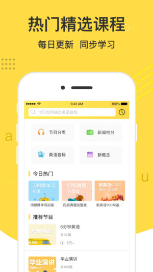 每日更新地道英语学习材料,带动听力、口语、单词、语法、阅读等能力的全面提升。 适合于 1. 想要提升口语能力的英语学习者 2. 想要提高中高考、四六级、托福雅思等英语考试成绩的学生 3. 想要带着宝宝学习英语的宝爸宝妈 总结一下:这款APP适合于所有想学英语的爱好者! 特色: 1. 每日更新地道学习素材,覆盖日常会话、商务职场、旅游出行,校园生活等各类场景。 2.每日更新地道实用的英语对话,带动口语、单词、语法、听力、阅读等能力的全面提升。 3.特别为零基础学员定制的音标课程,让你轻松搞定国际音标 4.免费的名师课堂及外教课堂,不定期更新