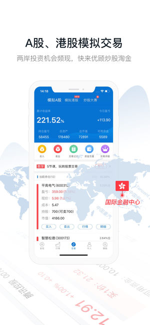 ——内容提要—— 国内最大的模拟炒股平台,下载量超6000万!提供极速A股行情、港股行情、全面财经资讯。10万模拟资金免费送,边玩边学,助你成为炒股高手。 ——产品亮点—— 【股票模拟交易】零门槛练习炒股,最受欢迎的模拟平台; 【超低佣金开户】3分钟网上实盘开户,万2.5超低佣金; 【牛人牛股追踪】实时追踪牛人交易,海量靠谱牛人任你选; 【股票智能预警】自选股重要信息、成交异动自动消息报警; 【自主创建比赛】用户可以创建各种类型炒股比赛,完全免费; 【人工智能交易】基于海量牛人交易数据,交易机器人媲美高手。 ——基础功能—— 【股票行情】A股、基金、封闭基金、沪深、深市、沪市、…