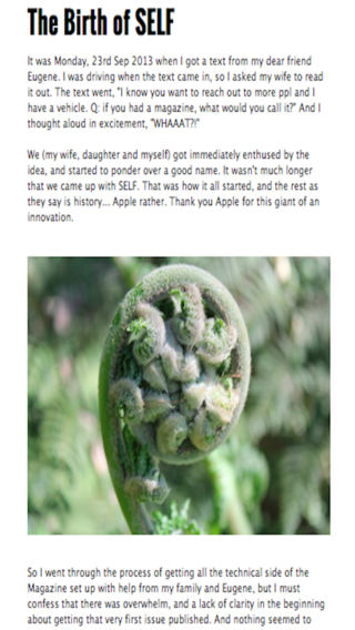 SELF is a Digital-only Magazine to be published Once a Month. It will cover aspects of self-development and inner personal growth, those which have deeply impacted me personally. SELF Subscription available: A single issue for $1.99 (non-subscription) 1-month subscription for $0.99, automatically renewed until canceled. Payment for all purchases will be charged to your iTunes account at the confirmation of your purchase. SUBSCRIBERS' AUTOMATIC-RENEWAL FEATURE: Your subscription automatically renews unless auto-renew is turned off at least 24-hours before the end of the current period. your iTunes account will automatically be charged at the same price for renewal 24-hours prior to the end of the current period (another year for annual subscribers, another month for monthly subscribers) unless you change your subscription preferences in your account settings. You can manage your subscriptions through your Account settings after purchase. No cancellation of the current subscription is allowed during active subscription period. Please go to http://selfappazine.wordpress.com/privacy-policy/ for more information.