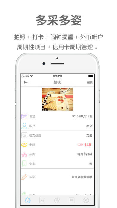 〈记账日记 PRO〉 是一个先进且易用的行动记账本. 前所未有的简单, 记账本就在您的口袋, 随身带着走! 精致介面风格, 支持多帐户与外币汇率管理, 云备份功能, APP密码保护(支持Touch ID解锁). 原来,记账也可以很简单 乾净的版面设计, 没有复杂繁复的操作方式 记账也可以是一个赏心悦目的旅程 【特色】 * 透过通知中心快速记账 * 支持自定日期区间统计功能 支持自订多组不同的日期区间,统计该区间内的收支情况。 (使用情境范例: 即时统计每个月6日到次月5日之间的收入支出。) 【专业级的记账功能】 以趋势图表显示记帐收支状况. 更提供支援帐目搜寻, 帐目闹钟提醒, 多国货币, 多重帐户管理. App密码保护, 以及云备份功能. * 多帐户管理 您可新增与管理多个帐户,记帐帐目简单「清楚明瞭」。 * 多国货币与汇率 您可为每个帐户设定「币別」与「汇率」,外币帐户记帐轻而易举。 * 可设定周期性记帐项目 如果您有每天或固定周期的花费,您可以设定重复性的记帐项目,大大减少每次输入的时间。 * 图形化呈现 透过趋势图与分类圆饼图,清楚观察每周,月,年的花费情况。 * 精致的分类 可以自订主分类与子分类,并提供直觉化的操作介面。 * 支持闹钟提醒 记账时可同时设定「闹钟提醒」,不再忘记未来的缴费或收支项目。 * 相机滤镜 拍照记账支援即时相机滤镜,让记账的生活更多采多姿。 * 支持打卡标示地点 记账时可以顺便打卡,并且可储存打卡记录,方便之后快速重复使用。 * 密码锁 支援密码保护与Touch ID解锁(iOS 8以上),可以设定开启App前的密码锁,您的记账本安全有保障。 * 支持iCloud, Dropbox, GoogleDrive等备份管道 * 支持汇出成CSV/PDF档 支援汇出记帐资料,并可以自行设定汇出时间范围。让您可以自行在Excel中浏览与分析。
