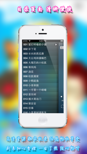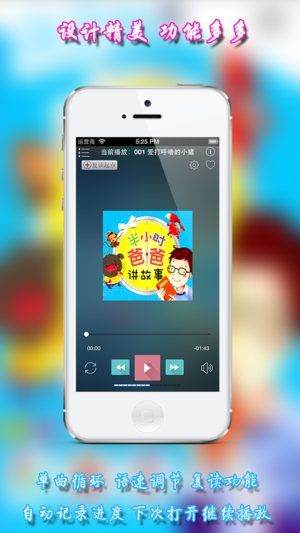 希望孩子能安静地睡觉吗?想给孩子讲述好听的故事吗?想让孩子学习儿童歌曲吗?希望孩子在学前就能得到语言和艺术方面的熏陶吗? 选择本应用吧,它能满足你上述一切要求,本应用包含多个小故事,主要围绕城市、友爱、分享等主题展开,培养孩子美好的情感、良好的自我意识、坚强的意志、高尚的品德、乐观自信的个性和活泼开朗的性格。 软件功能: 1.通用应用,同时支持iPhone,iPod touch和iPad设备 2.可以自动顺序播放功能 3.可以自动记录播放位置,不用担心下次找不到听到哪 4.支持离线播放,即使不联网也一样听,到哪都不怕 5.支持手动拖拽前进、后退播放 6.精确到分钟的睡眠定时功能…