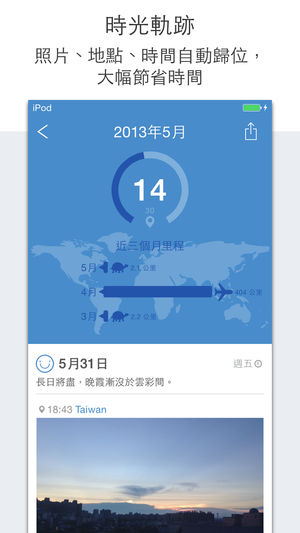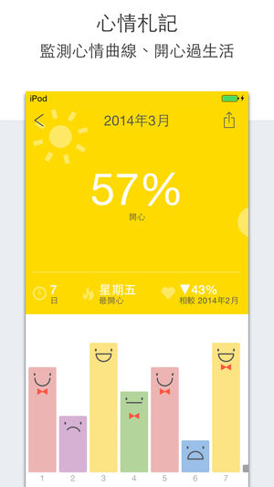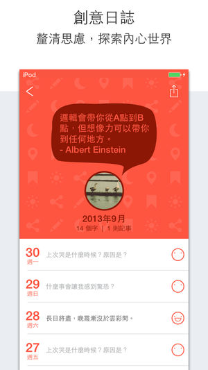 ***** 包含在新年新希望套装组合中,去看看吧! ***** DearDays自動將生活片段轉化成帶有資訊圖表的个人日记,不僅大幅節省記錄時間,更可讓你隨時掌握自我狀態,不斷提昇身心素質。 媒體介紹 ** [最美应用] DearDays - 你好,亲爱的时光 ** [App情報誌2.0] 《DearDays》女孩都該有的姐妹淘 ** [数字尾巴] 有爱轻记录 -- DearDays ** [Apps 頻道] DearDays – 輕鬆寫個人日誌 相片月曆 將手機照片以月曆形式陳列,讓回憶一覽無遺。精美的月曆格式激發拍照動力,讓你每天都想用手機記錄生活。當月曆空格全被填滿,所擁有的不…