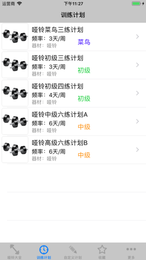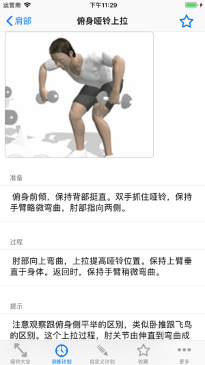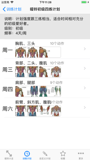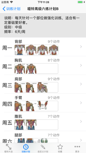哑铃是肌肉力量锻炼中最重要、最方便、最常用的健身器械,包含50组哑铃动作动画,是目前最齐全的哑铃健身大全。 经常更换哑铃动作,能更加全面的激活各个部位的肌肉。让肌肉得到全面发展。也可以自定义计划。 并提供来自健身教练推荐的5个参考计划。满足不同的哑铃爱好者的需要。 *哑铃菜鸟三练计划 适合锻炼以哑铃为主要器材的入门爱好者,在家里锻炼,锻炼1个月后换肌肉网上的其他健身计划。 *哑铃初级三练计划 适合有一定基础以哑铃为主锻炼的初级爱好者,在家里进行锻炼。 *哑铃初级四练计划 计划强度跟三练相当,适合时间相对充分的初级爱好者。 *哑铃中级六练计划A 适合有一定基础的中级爱好者,总体训练强度…