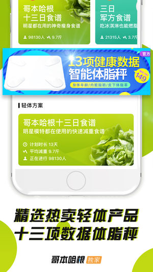 「哥本哈根减肥瘦身」 - 我的移动轻体专家 哥本哈根APP推出的快速瘦身计划「哥本哈根13天减肥法」推出后已经成为全世界最流行、最知名的快速瘦身食谱计划。 减肥瘦身中经常遇到的问题: - 不知道使用什么方法让自己的体重快速下降 - 去健身房坚持锻炼,跑步,可因为没有制定饮食或辅助计划而功亏一篑 - 没有合适的记录工具 - 网上成功案例太多太杂,不知道哪个靠谱,对自己有帮助 「哥本哈根减肥瘦身」的解决方式: - 为用户制定详细、定时定量的减肥食谱,帮助用户轻松达到快速瘦身目的 - 针对快速瘦身、保持身材、局部美化推出丰富的计划帮助用户进一步达到健美身材的目的 - 记录工具的体验专为现代人优…