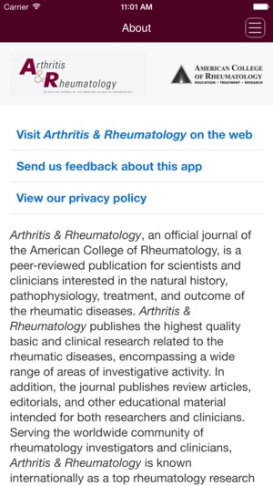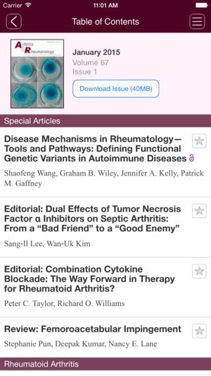The official journal of the American College of Rheumatology is now available on your iPad and iPhone. Fresh from the newsstand, “Arthritis & Rheumatology” brings you a stimulating, high-impact mixture of review articles, editorials, and other educational material intended for both researchers and c…