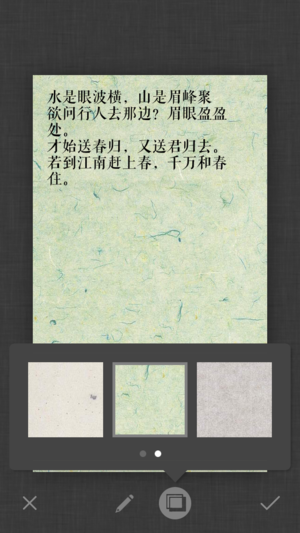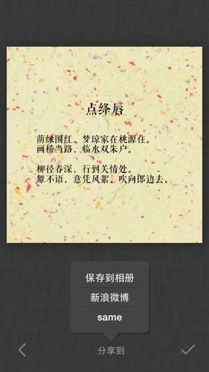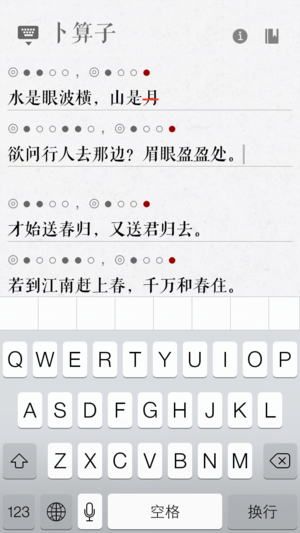 词Ci是第一款能够自动检查平仄、辅助填词的App。选择相应词牌后,即可以开始优雅流畅的填写。在写词过程中,除了会高亮出平仄不对的汉字外,还可以方便地查找同韵字、随时切换查看当前词牌的写作规则;除此之外,词ci还支持更换词笺纸背景,使您的习作完成后更加完美; - 简单易用的自然交互界面 - 精美优雅的词笺排版,自己的习作可以更换词笺纸背景 - 近100个常用词牌 - 近300首著名例词 - 中华新韵、平水韵、词林正韵,三种韵典任意切换 - 可以生成图片保存到相册、新浪微博、微信朋友圈