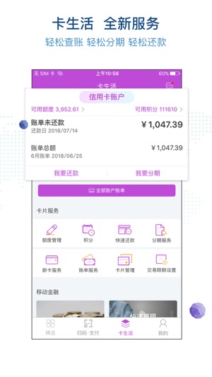 光大信用卡官方APP阳光惠生活—您的信用卡专属指尖服务APP,为所有用户推出改版的V4.0,设计简洁流畅,支持手机号码注册/登录客户端、支持手势密码登录和指纹登录(目前只支持iphone),让您随时随地享受7*24小时贴身信用卡管家服务,不仅包括信用卡账单、分期服务、快速还款、积分、卡片申请、优惠活动,还提供了有关餐饮、娱乐游玩等优惠电子券,为您提供最佳信用卡移动APP使用体验。 ---主要功能 1、“首页精选” 呈现精彩的营销活动展示、提供精选功能的快捷入口、光大头条、账户管家消息推送、精彩推荐、热门活动和全国各地区优惠活动等。让您及时方便了解光大信用卡最新信息。 2、“服务” 提供全部的服…