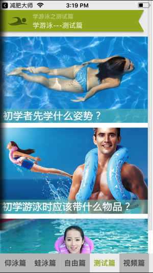 App Store中最据权威的游泳教程。让你从菜鸟到游泳神将的必备神器。 速成:只要你对游泳有一点点兴趣,打开教程看一看,迅速让你掌握游泳的窍门”! 易学:我不是一本枯燥的游泳教科书,用文字来阻碍你的行动,我是一个简简单单按照视频步骤动起来,就一定能够成功的宝典式App! 随时随地:利用你的任何时间,上班公交车,下班挤地铁,什么时候想看了拿出来看看,下次去泳池的时候照样做一做,你的朋友就会明显感觉到你的水平在提升。 本App中还有私人教学,游泳界明星手把手为您演示,让您深度了解游泳的各种速成技巧。