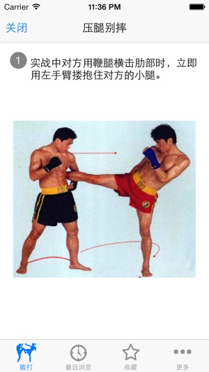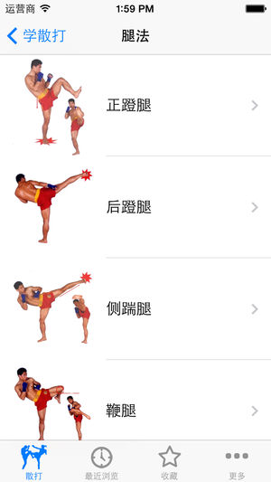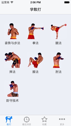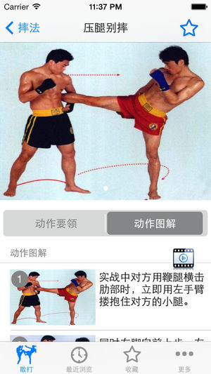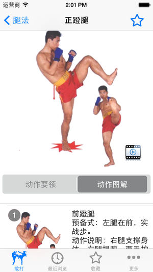 散打是散手的俗称,古称相搏,卞、弁、白打、拍张,手战、相散手等,由于徒手相搏相角的运动形式,在台子上进行,又称“打擂台”。散打是中华武术的重要组成部分,是中华民族的传统体育格斗竞赛项目。它把武术套路中的攻防动作拆散开来,根据当时对方的不同情况、特点,任意组合,灵活运用,随情变化,以踢、打、摔为进攻形式,以格挡闪躲为防守策略,猛冲巧打以谋取胜为根本指导思想。 该软件助您掌握泰拳快速入门与实战绝技。包括步法、拳法、肘法、腿法、膝法、摔法的动作要领和动作图解,以及视频。如果你想成为高手吗,不妨学习这世界上凶猛的搏击术吧 离线使用,不用上网也可以使用,速度快,无广告