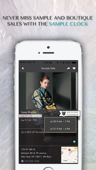 Become a fashion insider with Sample Closet! Sample Closet allows you to access exclusive information on the latest designer sample sales in New York City. Features include: - Live maps to direct you to sample sale venues - Sample Clock, an alarm tool that synchronizes with your iPhone Calendar to remind you of upcoming sales - Private sales information of boutiques and brands It’s the must-have shopping app for all seasons to come!