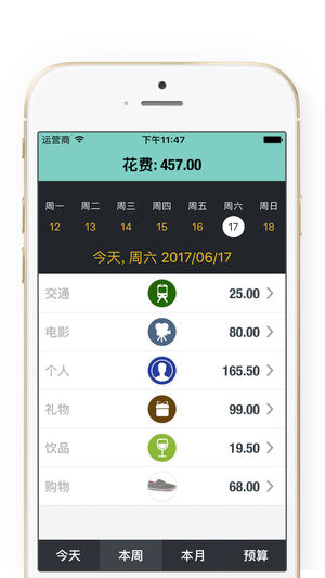 由苹果公司精选为“最佳新应用”,“编辑推荐”。 ••• 荣获(2014-2016年 美国(USA)第 8 名和加拿大(Canada)第 5 名)财务榜专栏 强力推荐作品••• •••曾超过 50 多个国家排名第一的个人理财工具••• •••App Store 上的精选最佳新应用超过 100 多个国家••• 她会成为你最需要的,当你在完美的旅途中! 她可以帮你跟踪平时的所有开支情况,自动统计每周和每月的消费,减去不必要的开支! 她将通过一个简单而有效的方式来组织你每天、每月的个人预算,所有预算都会以直观、华丽的方式表现出来;清楚地告诉你的类别,每天、每月花了多少钱,同时预算你在近期还有多少…
