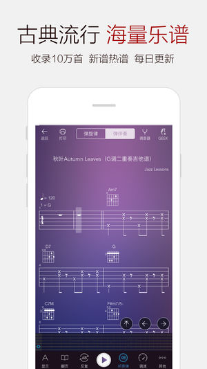 吉他谱大全是一款集找谱、识谱、互动、交流于一体的吉他学习平台, 也是目前最方便最美观的吉他谱浏览器。 内含数万首精选吉他谱, 不管你是喜欢弹古典, 还是弹流行, 都能一键找到你喜欢的乐谱, 并与众多网友和专家进行学习和交流, 迅速提升吉他演奏水平。 如果您是一名初学者, 它的吉他指板模拟演奏功能, 极大的降低了识谱难度, 即使您不会识谱, 照样可以学会弹琴! 它不仅提供许多初学者适用的练习曲, 还有许多好听但难度低的世界名曲, 让您的学习过程充满乐趣! 如果您是一名高手, 那它就是为您准备的一个海量移动乐谱库, 只需要有它在手, 再也不用背着厚重的乐谱书到处跑了, 也不必为找不到谱子而发愁!