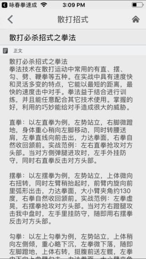 App Store中最据权威的散打教程。让你从菜鸟到高手的必备神器。 速成:只要你对武术有一点点兴趣,打开教程看一看,分分钟让你成为散打界中的“武林高手”! 易学:我不是一本枯燥的散打教科书,用文字来阻碍你的行动,我是一个简简单单按照视频步骤动起来,就一定能够成功的宝典式App! 随时随地:利用你的任何时间,上班公交车,下班挤地铁,什么时候想看了拿出来看看,有空的时候照样做一做,你的武艺时时刻刻都在不断提升。 本App中还有私人教学,散打界明星手把手为您演示,让您深度了解散打的各种招式。