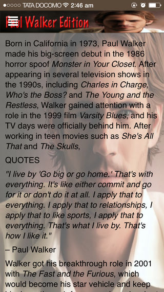 Paul Walker Edition Special app for Paul’s fans. Weekend Celebration Offer. Get 66% Off For this weekend. Usual rate is 2.99$. Buy your copy before this weekend! Enjoy! The best Paul Walker app for 2014 Includes: * Paul Walker Full Biography * Exclusive Videos of his life * Paul Walker tribute videos * His classic appearance in old movies, you may rarely seen before. * Paul walker best moments that always keeps him live in our memories. * Paul walker Official Facebook page, Twitter and Instagram Wall. * RIP: Some of the videos of paul walker’s last days and last interview, and last footage of caught on camera before his death. Get this amazing app before celebration goes off! All copyrights are owned by their respected owners. This app is not endorsed by, or affiliated with Paul Walker, or their affiliated entities.
