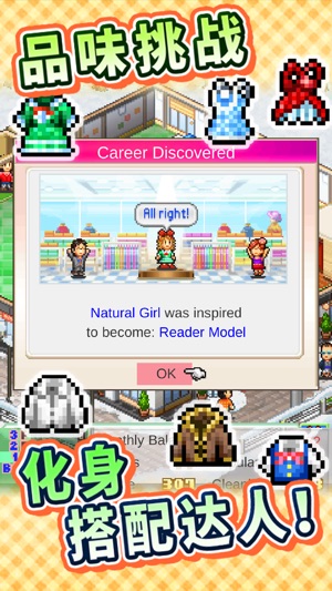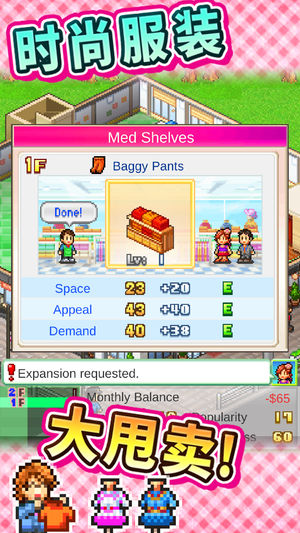 这是一部经营服装店的模拟游戏。 从平价小店做起,以世界名牌为目标加油吧! 摆放时装模特、开设可丽饼店……丰富你的时装店,让客人乐享其中吧! “明天约会不知道穿什么好……” 解决少女烦恼的就是你!时尚搭配大师! 随着顾客的时尚品味提高,说不定还能发现新的职业并转职哦。 如何,你对自己的时尚品味有信心吗? ---- ※游戏数据将被保存在终端。不支持删除或重新安装应用软件。 更多游戏请搜索“Kairosoft”哦。 http://kairopark.jp 有许多您可能熟悉的免费游戏和一次性付费游戏! 请记住2D像素画风的Kairosoft游戏系列哦。 最新信息请关注我们的推特。 http…