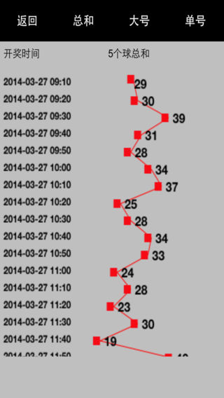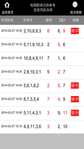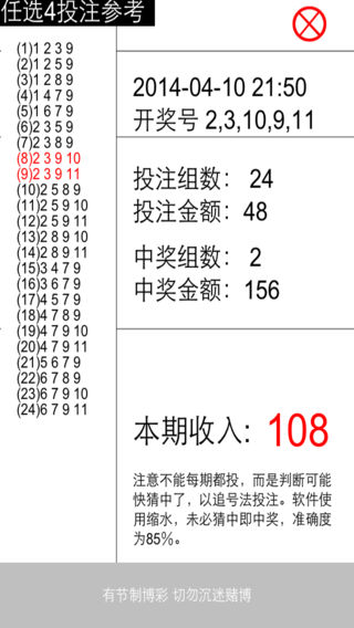 主要功能:彩票奖号分析,下期开奖胆球推荐,聪明组合。 高频彩不会一夜暴富, 但可以成为一项职业 本程序由职业彩民提供投注思路和方案 软件每期会为您预测下一期的1个胆球和2中1球。胆球即必出球,2中1球,就是2个号码必出一个但不同时出的球。请查看表格最末尾,最新一期处会有这三个号码。不保证期期准,胆球准确率约65%,2中1球准确率约80%(2个号有1个红字就成功),胆球和2中1球同时猜中,红字猜中会出现,本期会中奖。 利用1个胆球和两个2中1的球,最简单的组号投注是任选二。假如胆球是01,2中1球是02,03,那么只要投2注:01,02和01,03。就一定中奖。最好结合你自己的经验,投任选3,任选4,任选5,提高奖金。本软件专门设计了任选4的组号程序,以最小的投注,夺取更大的奖金。 追号投注法是指一直投固定号,直到他中奖。我们是追固定方法,直至他中奖。请看前面的预测表,猜中期数之间会有空档,一般最大空格在8个,也就是说,本期中奖后,最多再过8期左右又可以中奖。只要计算好,适时加大投注,就有机会中大奖。所以,建议中奖后即时停止投注,等过2-3期没猜中时,再开始设计追号,收益机会就很大。 只要用我们提供的胆球A和2中1球BC,和另外8个号选3个DEF(多试几个DEF),可组ABDEF和ACDEF,将大大提高任选5的中奖机会。我们经过测试,认为任选4的中奖机会最多,即在ABC准确时,软件从另8个号选中2个的准确性较高,收益机会大。 彩市有风险,投注量力而行。